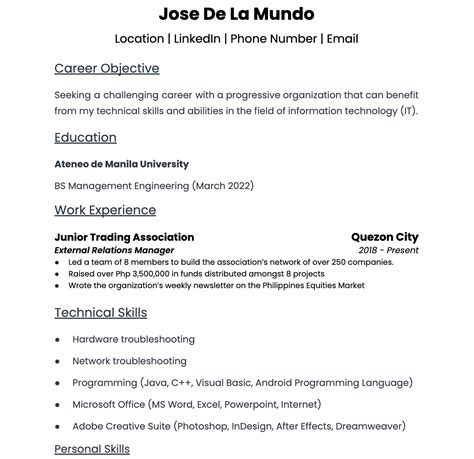 Sample Resume For Fresh Graduates With No Experience Philippines New Resume Fresh Graduate No Sample Resume Format Nursing Resume Template Resume Template Word from i.pinimg.com Download the resume template here. There are a few dominant resume templates in use today: Jobs for electrical engineers are projected to grow by 7% (or 21,300 jobs) from 2016 through 2026, according to the bureau of labor statistics (bls). Jan 23, 2020 · this resume summary for a medical scribe started by emphasizing technical skills fitting for an ideal candidate. You can use various visual elements to make your resume stand out. It also indicated an internship experience which most recruiters prefer from fresh graduate applicants, and soft skills ideal to perform the tasks. Chronological, functional, and hybrid, which is a combination of the two. The sample resume format above incorporates an interesting color choice to his resume.